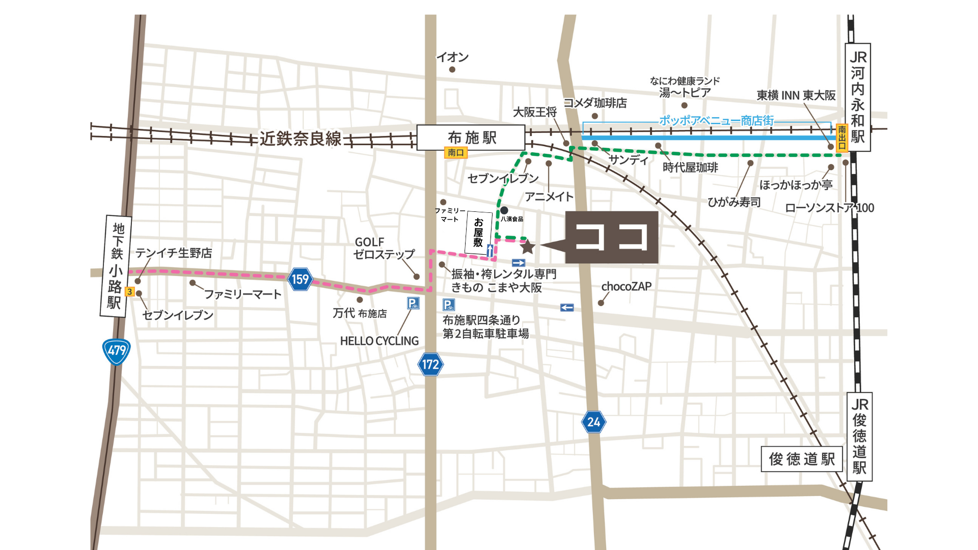 | 最寄駅 | 【近鉄:布施駅下車】 ▶︎奈良線・大阪線どちらでも下車します。 [急行][準急][普通]にご乗車ください。 ⚠️[快速]と[特急]は停車しません。 ・南口改札をでて東南出口より徒歩4分 【大阪メトロ:千日前線・小路駅下車】・3番出口より徒歩13分 【JR:河内永和駅下車】 ▶︎新大阪から約22分 ▶︎JR大阪東線 [久宝寺行き]に乗車します ▶︎南側1番出口より、徒歩13分 【バス🚌】 |